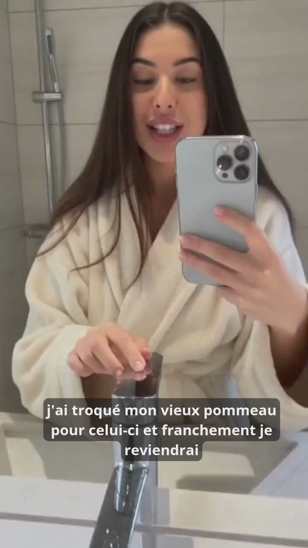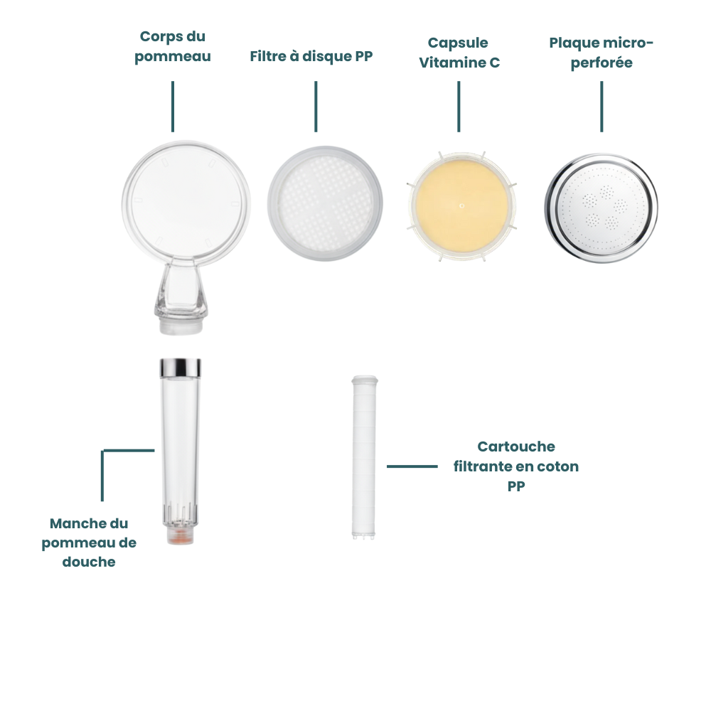 Un filtre dans la tête et un autre dans le manche pour réduire les impuretés, le chlore et les résidus.